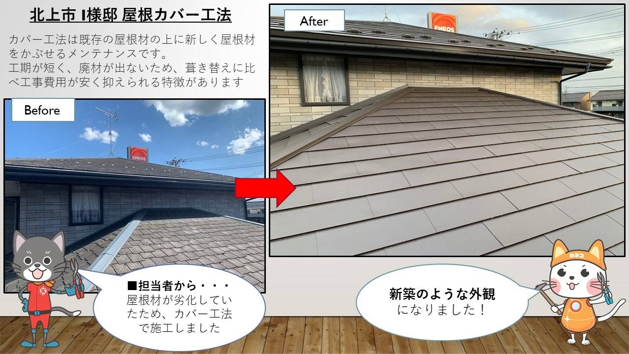この写真は岩手県北上市で実施した【屋根カバー工事】のBefore・Afterです。一見きれいに見える屋根材も確実に劣化しています。この施工事例では屋根材の劣化が認められた一方、屋根下地はきれいな状態であり、強度も充分でした。そのため、既存の屋根材の上に新しく屋根材をかぶせる屋根カバー工事という工法を選択しました。葺き替えに比べて短工期で、廃材が出ない=処分費用が掛からないため、比較的お求めやすい費用で施工することができます。